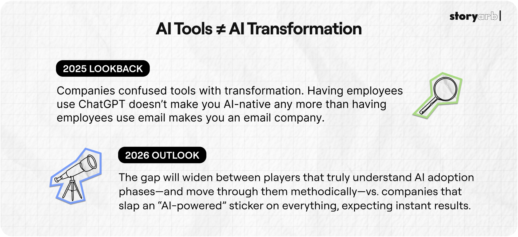 A lot of 2025’s disillusionment with AI came from companies expecting plug-and-play transformation. In reality, becoming AI-first requires hundreds of hours of rebuilding workflows.